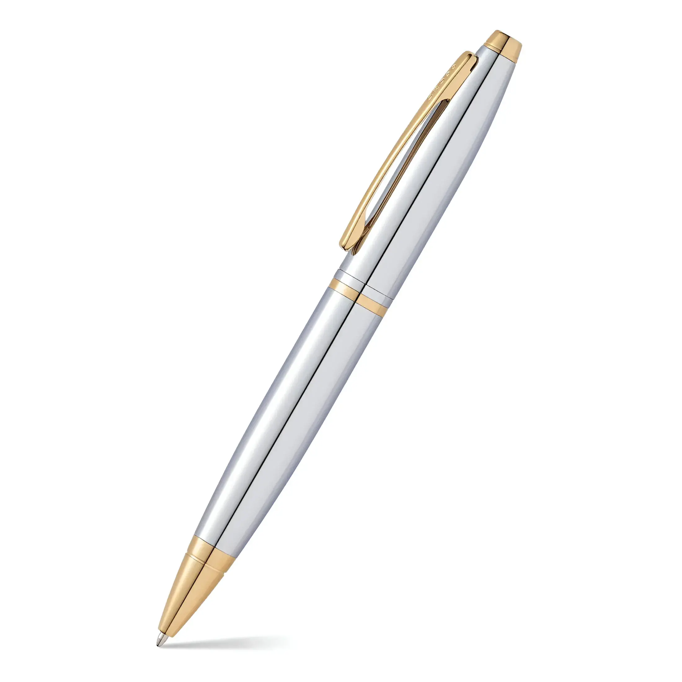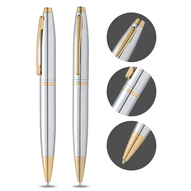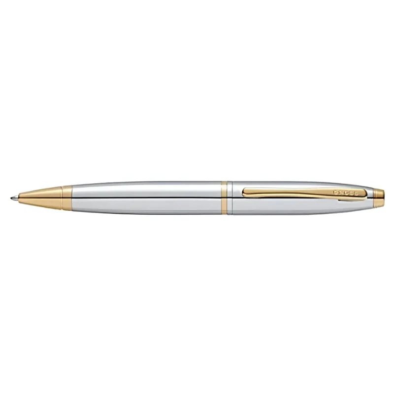 The Cross Calais Medalist Ballpoint Pen GT is a distinguished writing instrument that exudes timeless elegance and superior craftsmanship. Its sleek, polished chrome barrel is beautifully contrasted by luxurious 23-karat gold-plated trim, creating a sophisticated aesthetic that makes a bold statement in any professional or personal setting.