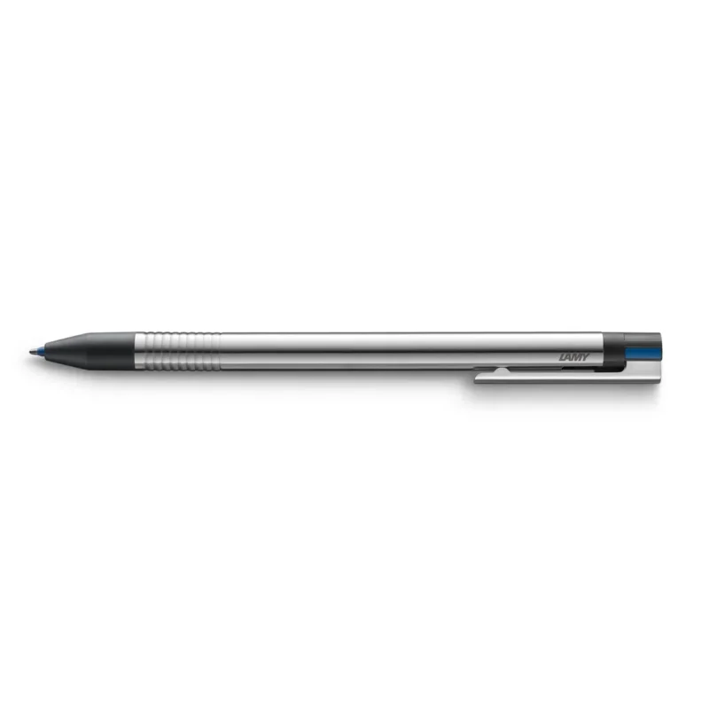 The Lamy Logo 3 Colors Multisystem Pen exemplifies sophisticated functionality with its multicolored ink options and automatic color selection display. Crafted from matte stainless steel, this pen not only looks sleek but also ensures durability. It comes equipped with LAMY M 21 refills in black, blue, and red, offering versatility for various writing tasks.