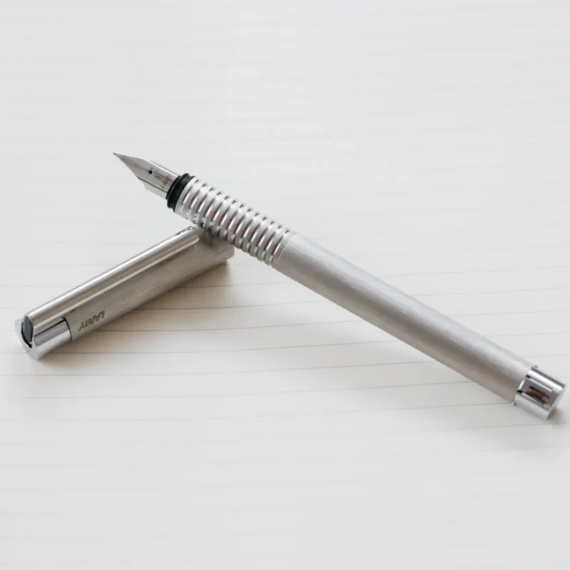 The Lamy Logo Brushed Fountain Pen is a timeless writing instrument that combines a sleek, minimalist aesthetic with exceptional performance. Crafted from a brushed stainless steel body, the Logo features a comfortable triangular grip section that provides an ergonomic hold during extended writing sessions.